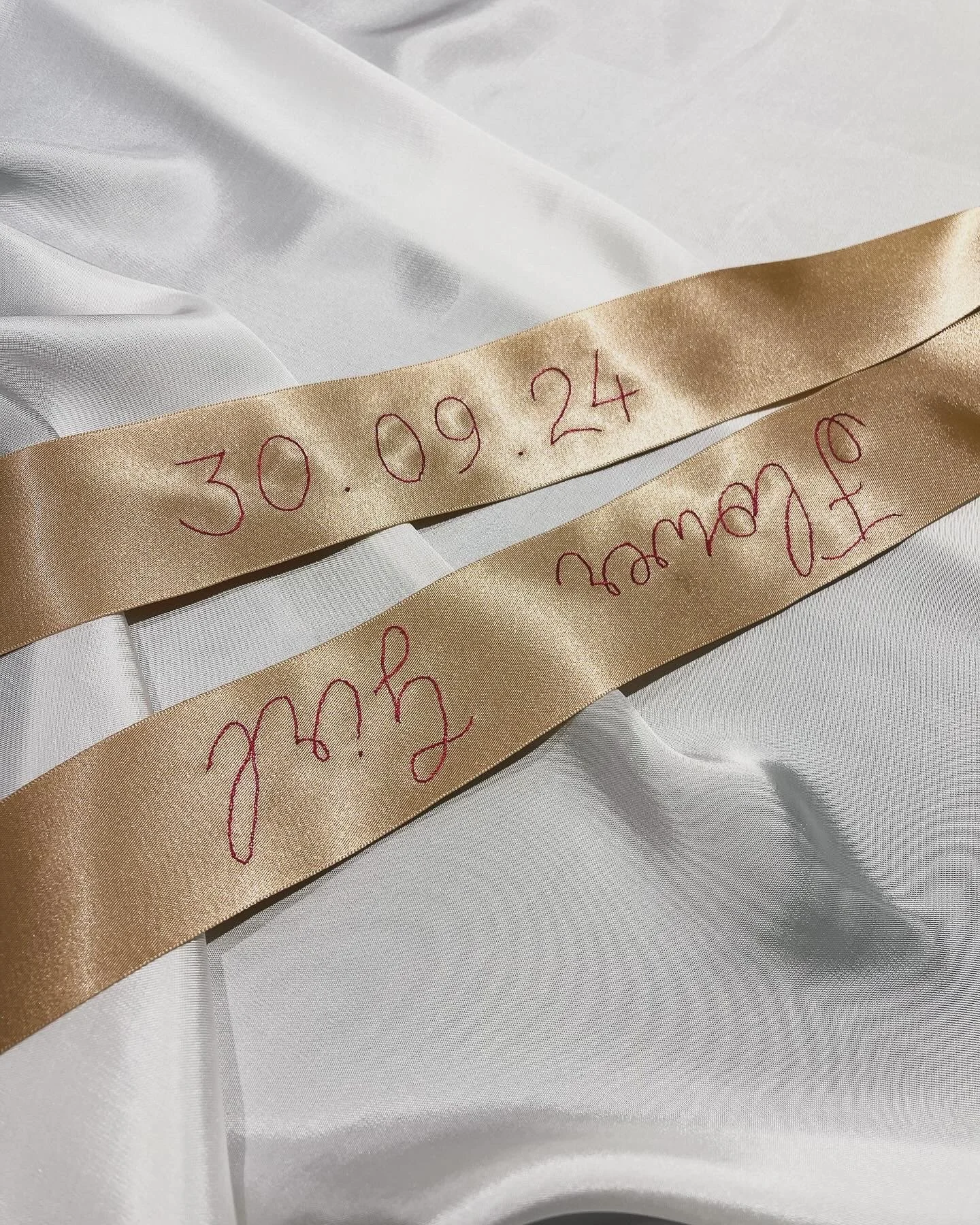 Name ribbons come with: two first names embroidered on one side and a date on the other. Prices vary based on the length of the names being embroidered. Feel free to fill out the form to receive a quote before finalising details!