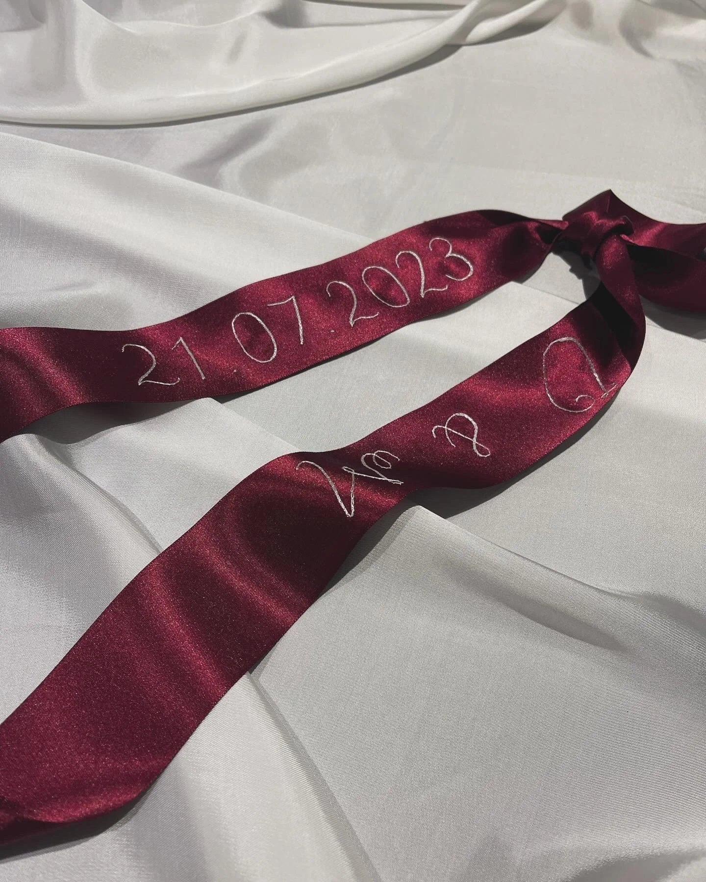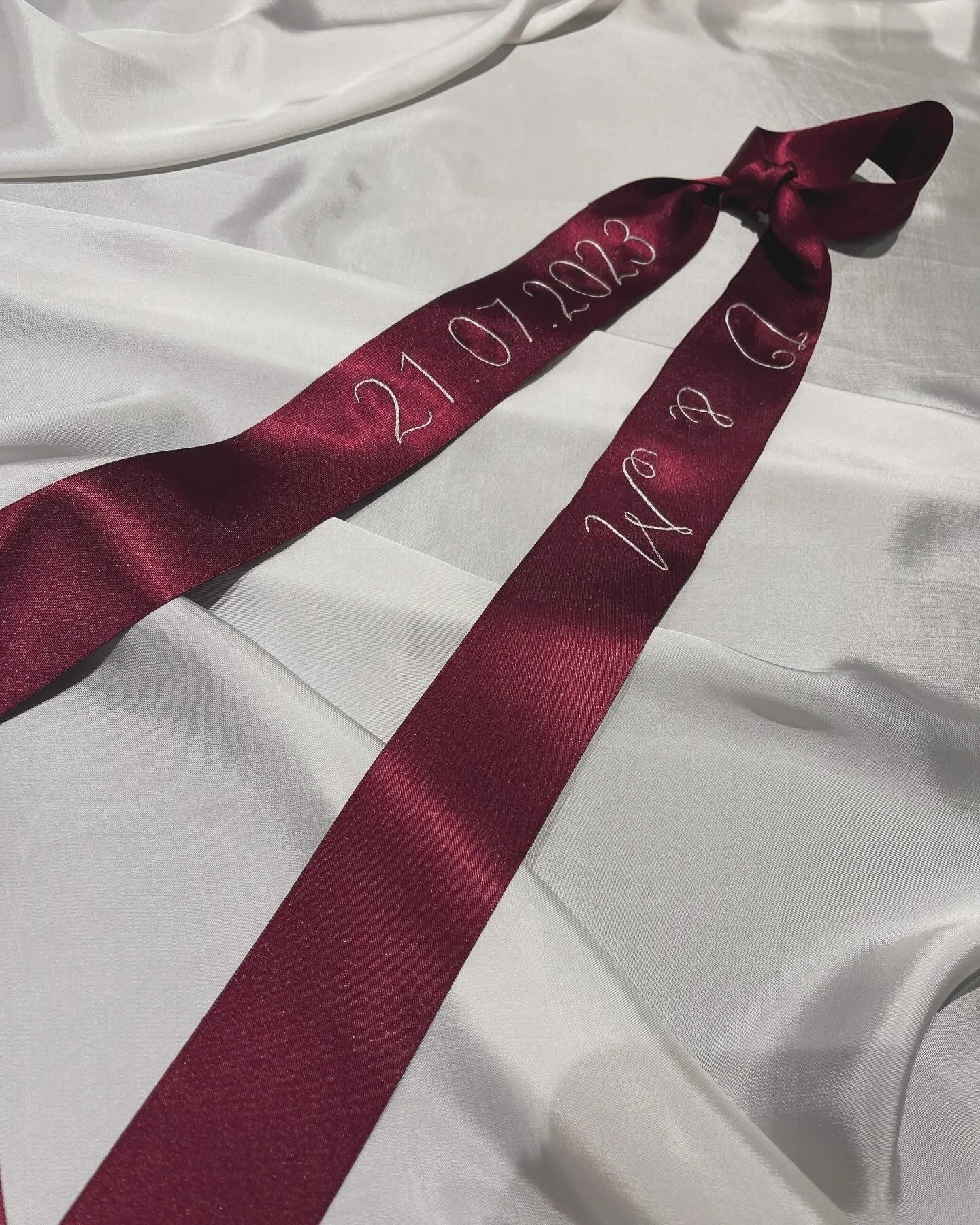 Each ribbon is custom embroidered with the names of the couple and the wedding date, creating a unique and meaningful keepsake.