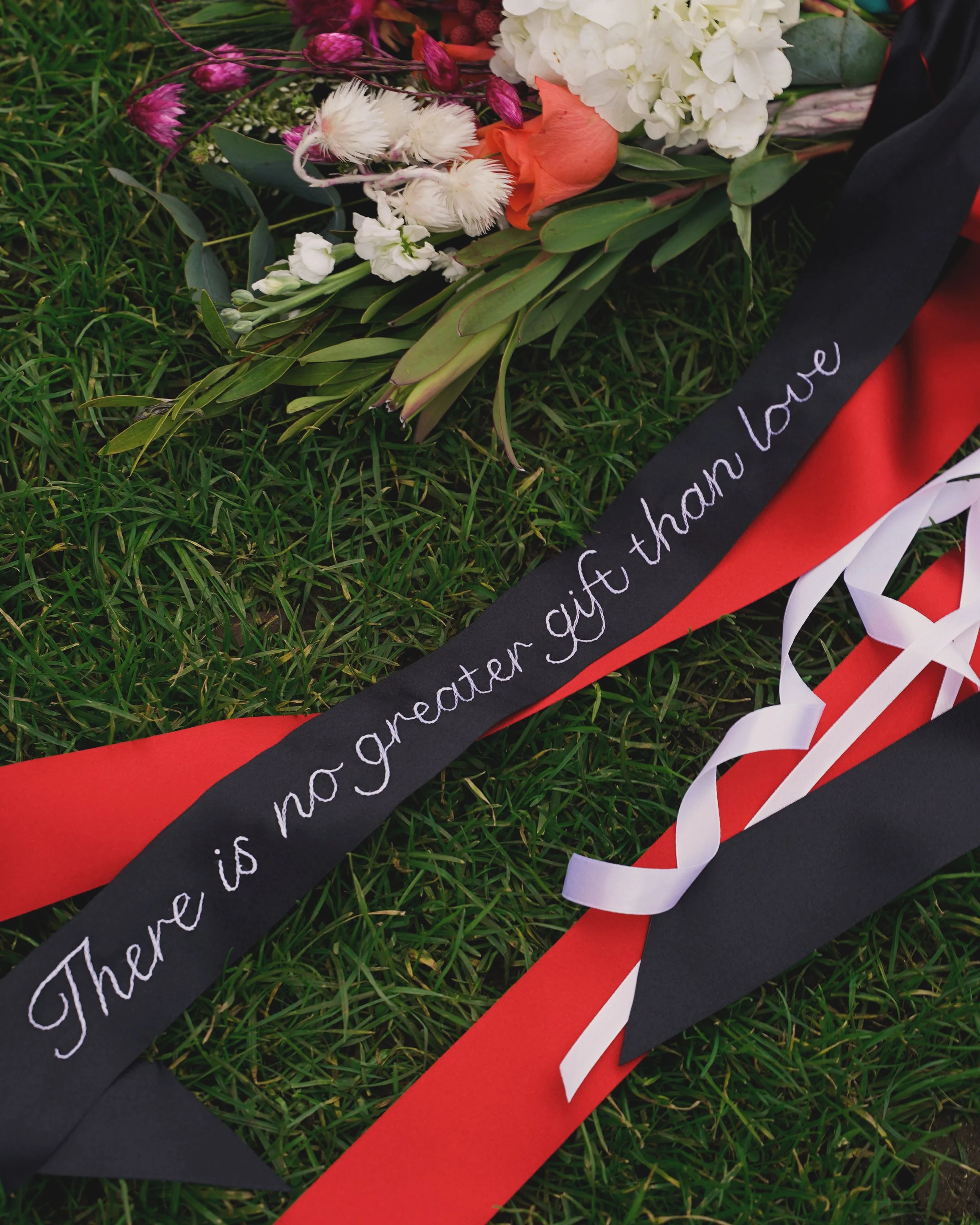 This ribbon comes with ‘There is no greater gift than love’ and hand embroidered along one length. Include your names, dates, surnames or left plain. Additions can alter the price, so for an accurate quote or to order, please fill out the form.