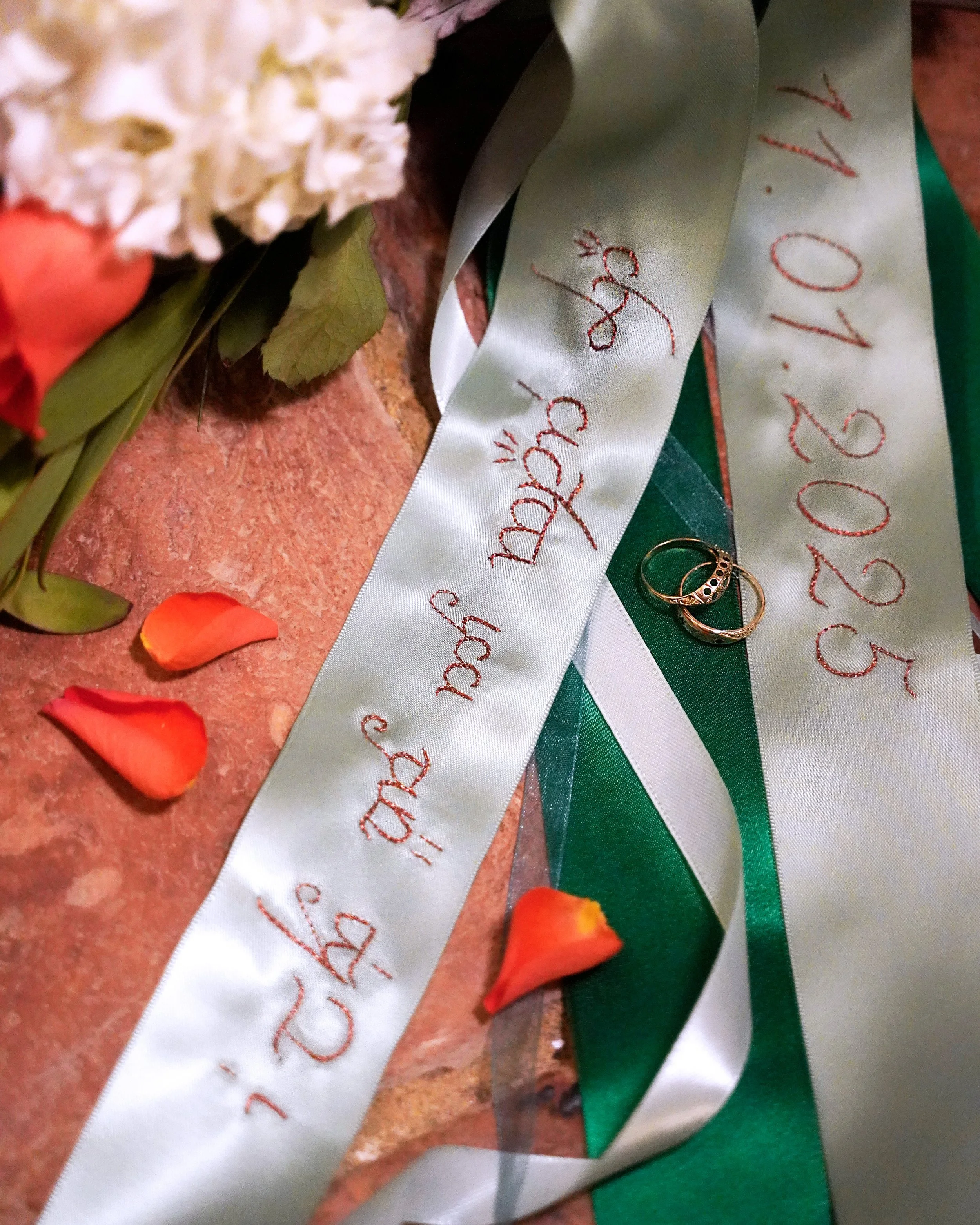 This ribbon comes with Elvish - ‘I love you no matter’ and your wedding date, embroidered down another side. The date can be changed to names, surnames, English translation or left plain as to your wishes. Any customisations will alter the price, so for an accurate quote or to order, please fill out the form.